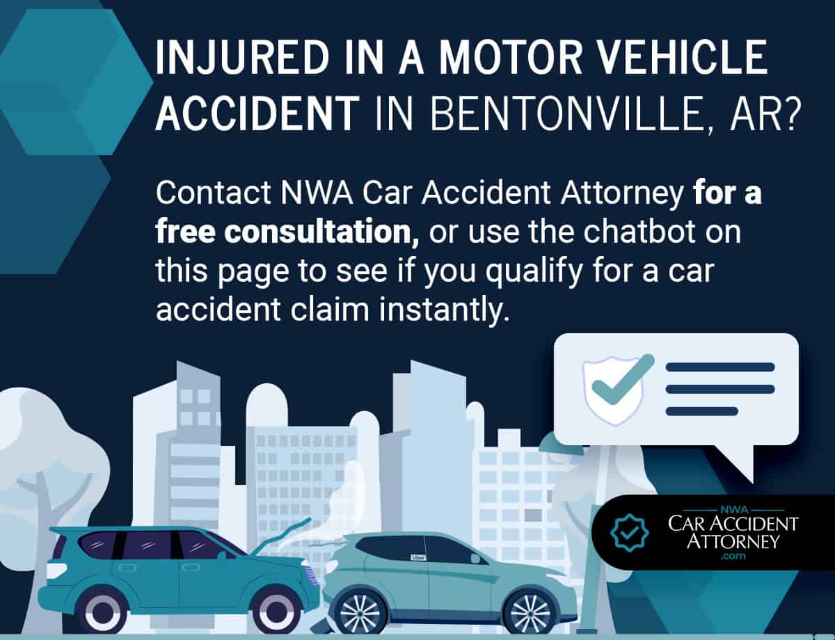 Contact the Northwest Arkansas (NWA) Motor Vehicle Accident Attorneys for a free consultation, or use the chat on this page to see if you qualify to file a Bentonville motor vehicle accident claim instantly.