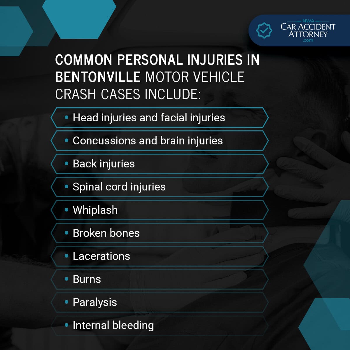 Common personal injuries in Bentonville motor vehicle crash cases include: