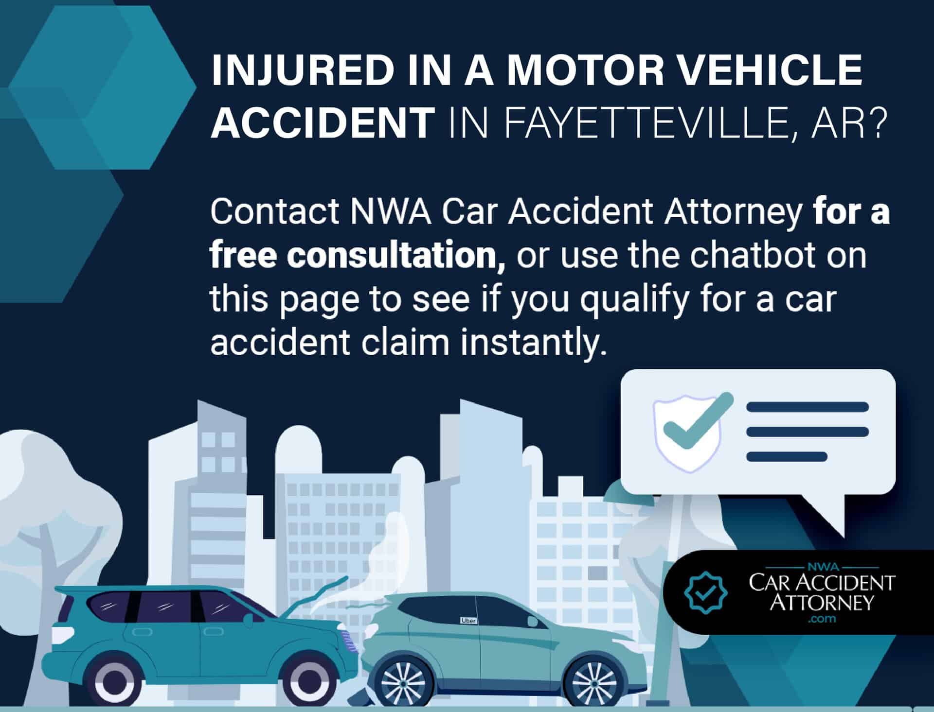 Contact the Northwest Arkansas (NWA) Motor Vehicle Accident Attorneys for a free consultation, or use the chat on this page to see if you qualify to file a Fayetteville motor vehicle accident claim instantly.
