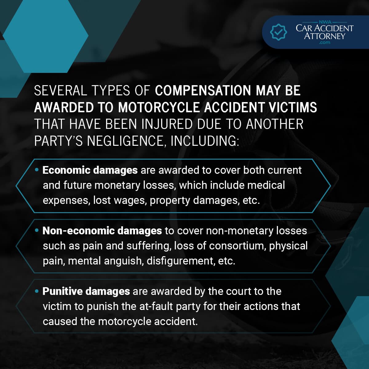 This is awarded by the court to the victim to punish the at-fault party for their horrible actions that caused the motorcycle accident.