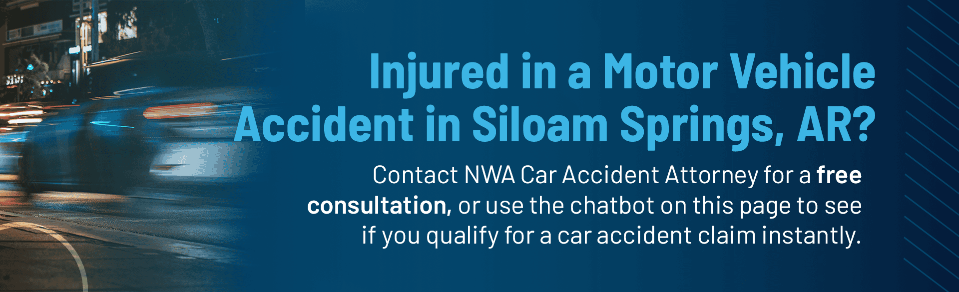 Contact the Northwest Arkansas (NWA) Motor Vehicle Accident Attorneys for a free consultation, or use the chat on this page to see if you qualify to file a Siloam Springs motor vehicle accident claim instantly.